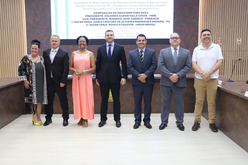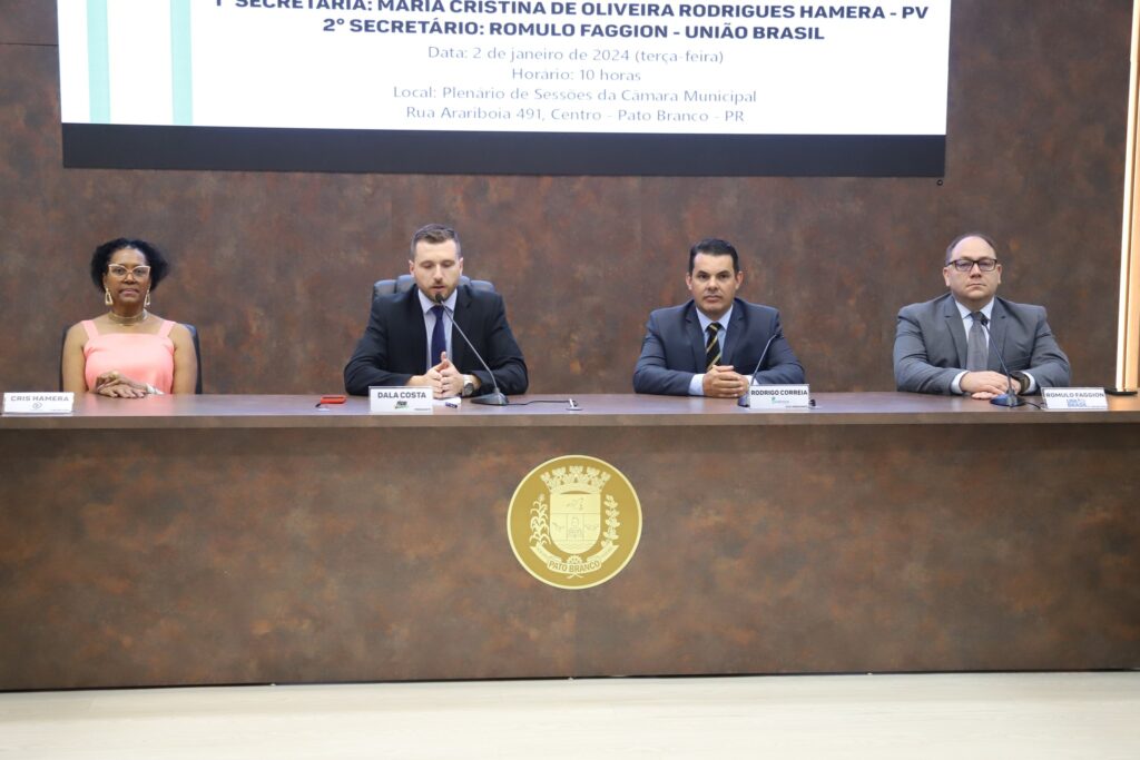 A posse de Eduardo Albani Dala Costa (MDB) como presidente teve algumas peculiaridades. Eduardo, terá como vice-presidente o vereador Rodrigo José Correia (Podemos) e secretários Maria Cristina de Oliveira Rodrigues Hamera (PV) e Romulo Faggion (União Brasil). Dala Costa substitui na presidência Thania Caminski (PP).